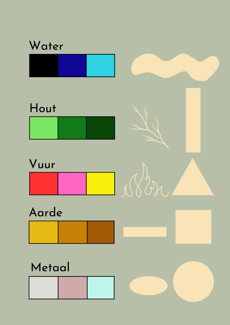 In de Feng Shui filosofie wordt gebruik gemaakt van de 5 elementen-leer. Te weten: Water, Hout, Vuur, Aarde en Metaal.