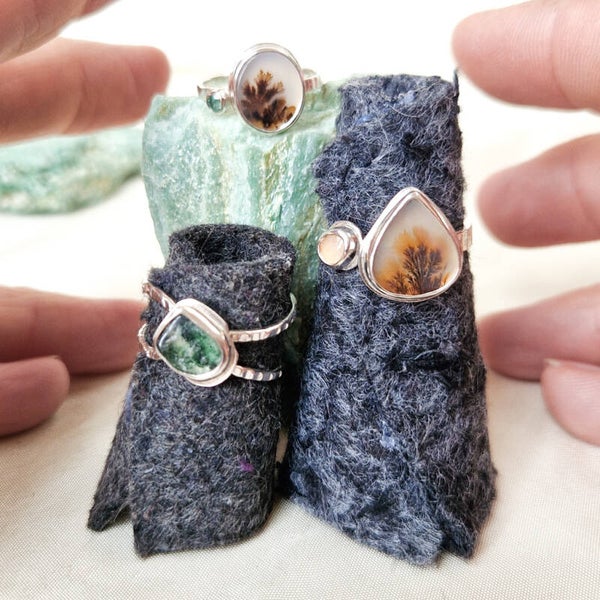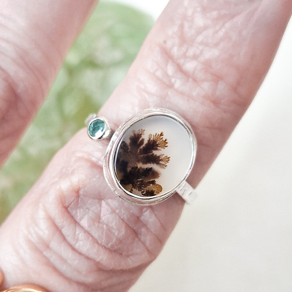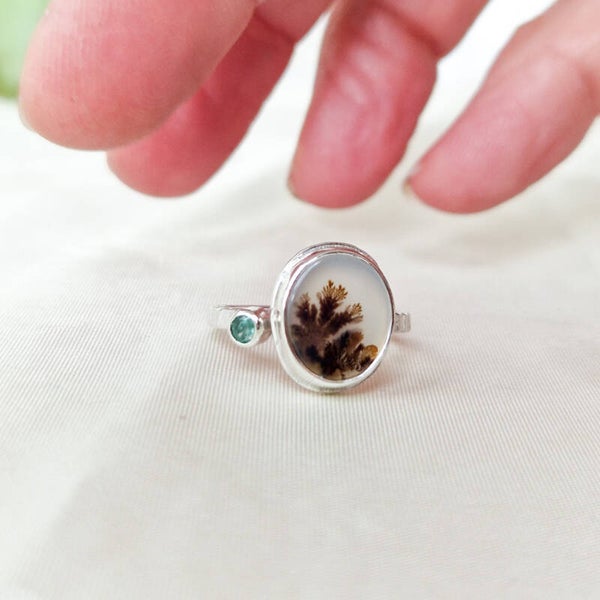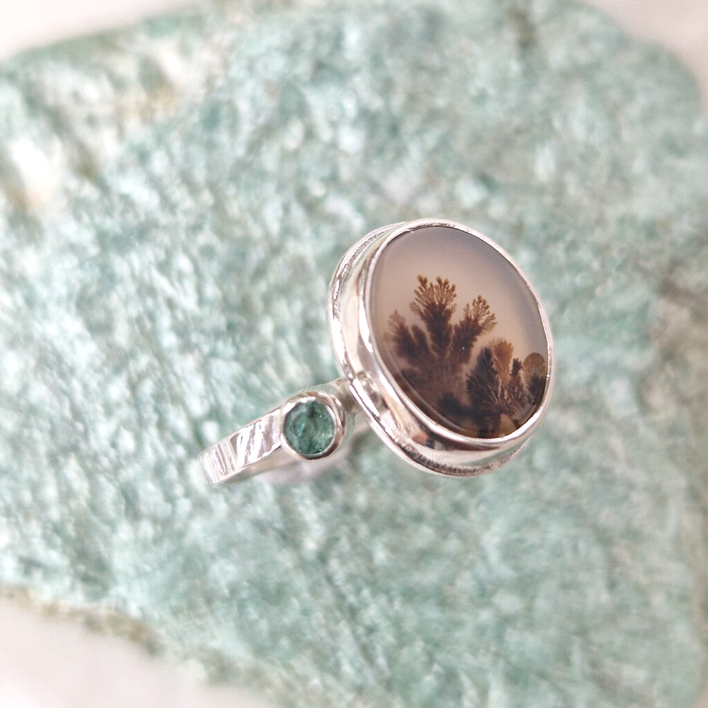 Zilveren ring met Dendriet agaat (ovaal 12x10 mm) en Smaragd (rond facet 4 mm) op een ringbandje van 3x1,5 mm met een boomschors textuur afwerking.