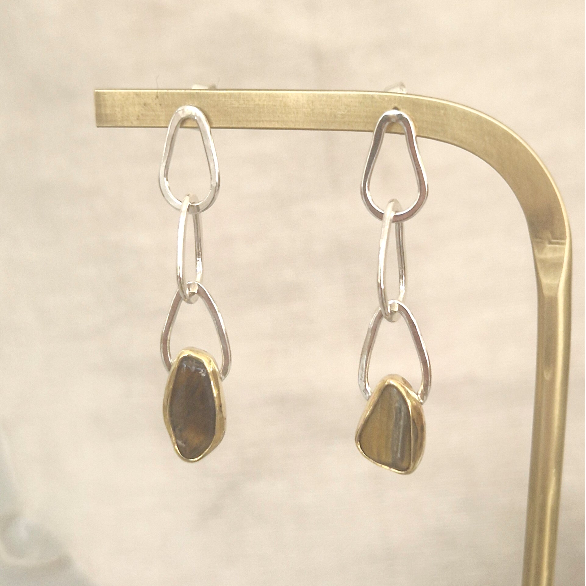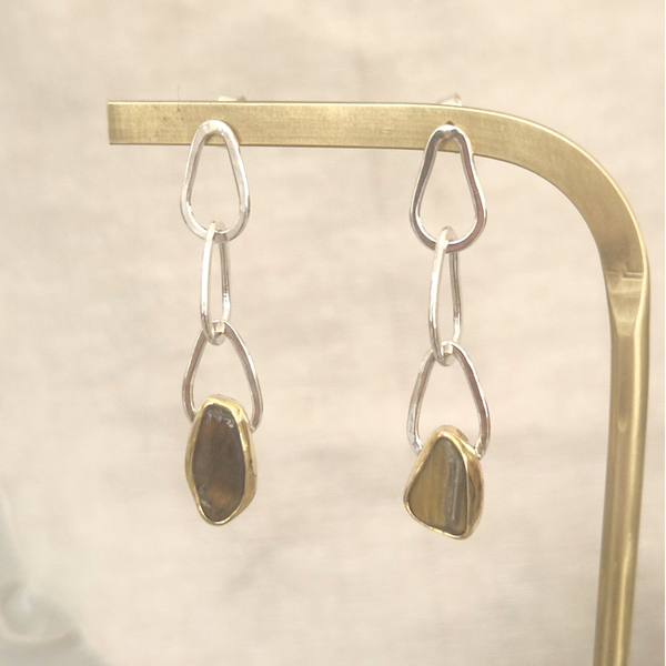 De stenen op de oorbellen zijn een organisch gevormde Tijgeroog ca. 10x7 mm, gezet in een messing zetting.