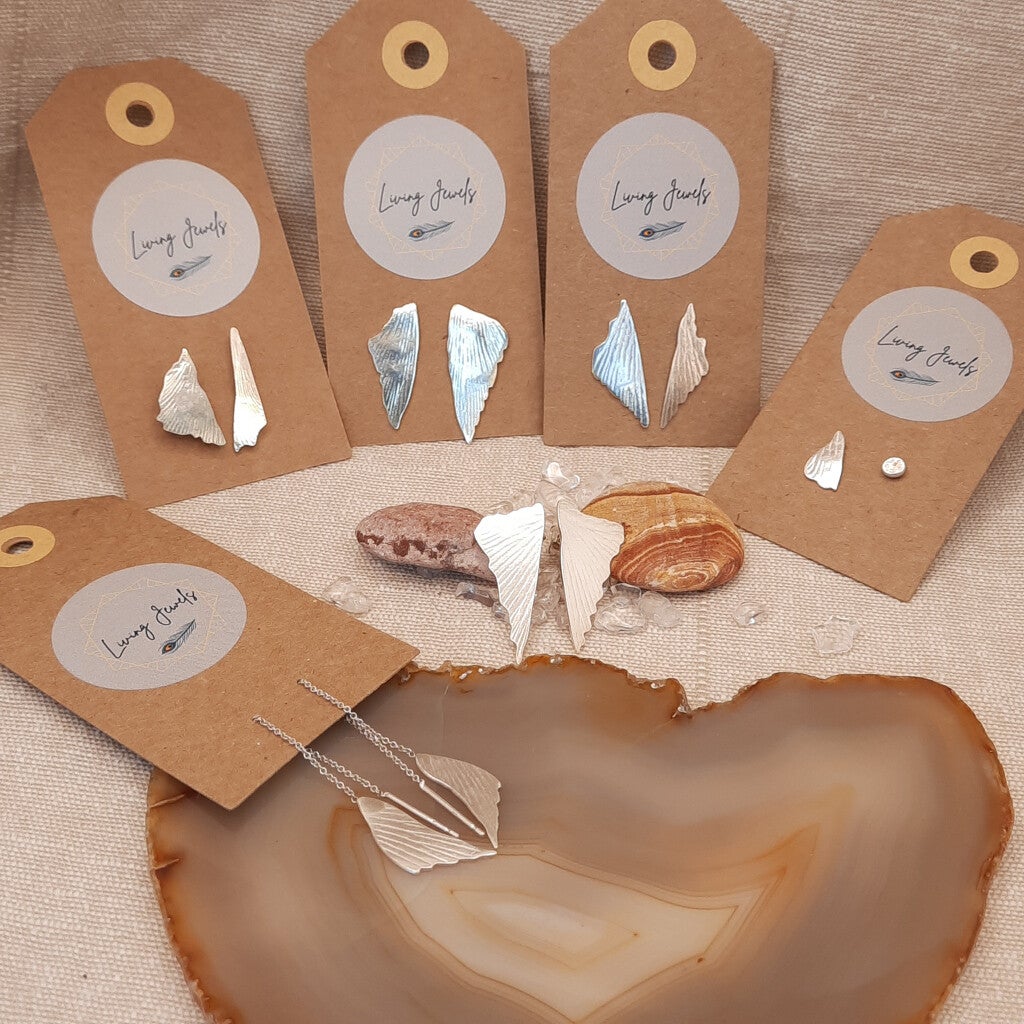 De oorbellen zijn gemaakt van sterling zilver. Het relief is er in gewalst van een blaadje Ginko Biloba. Het blaadje is maar 1 keer te gebruiken dus de afdrukken zijn altijd uniek, net als een vingerafdruk. De vorm ontstaat organisch en vind zijn weg in de juiste glooiing die je oor en hals elegant benadrukken.