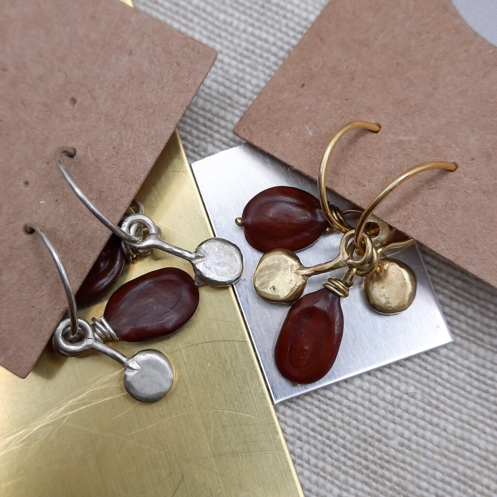De oorbellen zijn gemaakt van messing. Het oorringetje heeft een diameter van 1,2 mm en is gemaakt van 0.8 mm dik draad. Het bruine zaadje is een Appel zaadje met een prachtige warme bruine kleur. Het appelbedeltje geeft een knipoog aan het zaadje. Ze spelen sierlijk langs je gezicht.