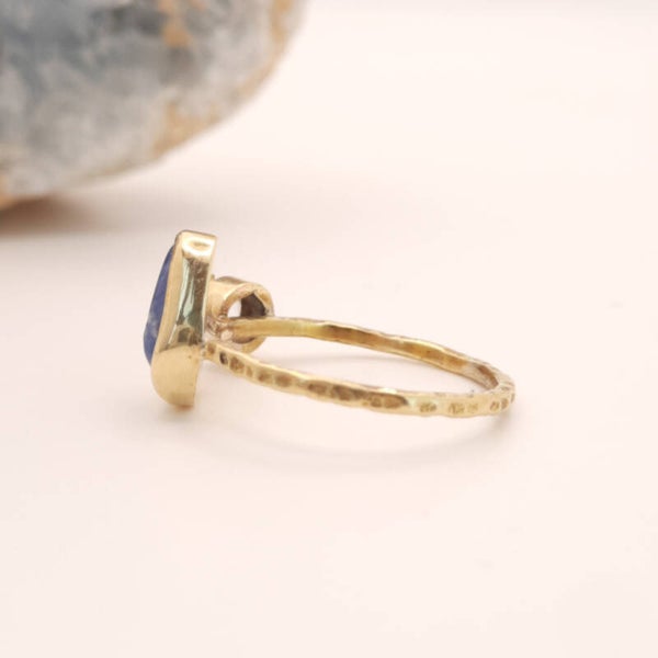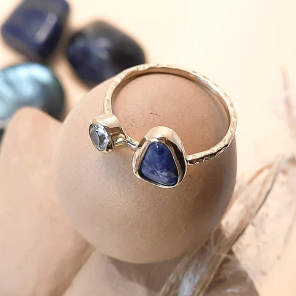 De stenen op de ring zijn een Sodaliet en Groene Amathyst, facet geslepen. Rond 4 mm.