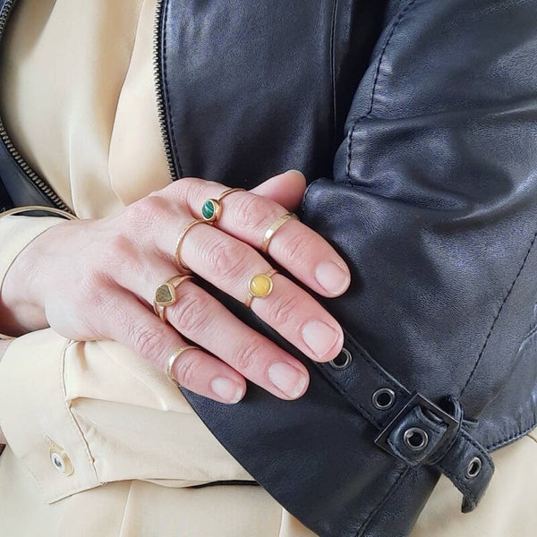 SOLD Messing coinring Gele Jade in zonnestraal krans zetting
