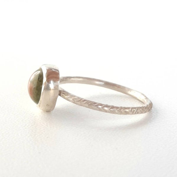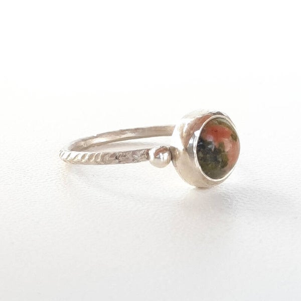 De steen op de ring is een Unakiet rond 8 mm met een klein bolletje om het af te maken. Gezet op een ringbandje van rond 1,5 mm met een V- slag afgewerkt.